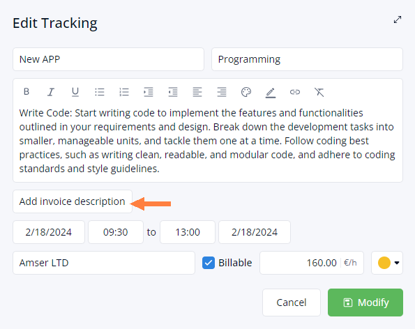 - Two descriptions: add an internal note for your team and a clean client‑facing description for exports.