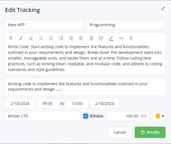 Team members start the timer when they begin, and stop it when they’re done. Each entry inherits the project’s hourly rate and billable status — you can change the billable flag on the entry if needed.
