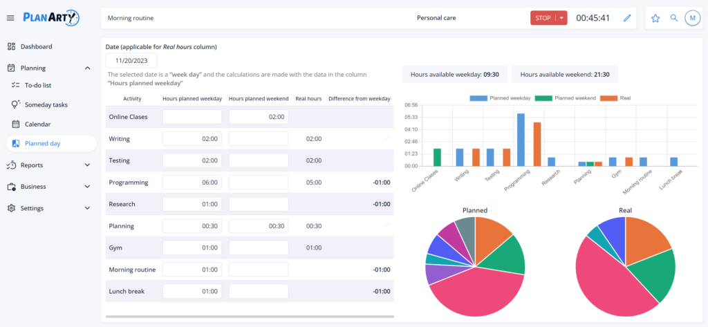 This analytical feature is PlanArty’s core predictive tool and the source of its praised financial intelligence. It goes far beyond simple time logging by systematically comparing estimated hours (The Planned Day) against actual effort (The Real Day). This variance analysis is critical for two reasons: